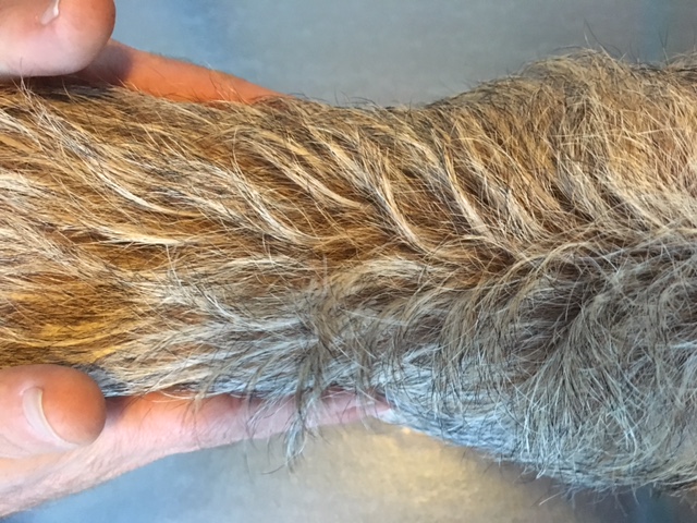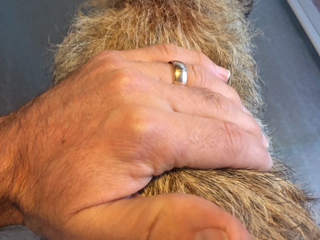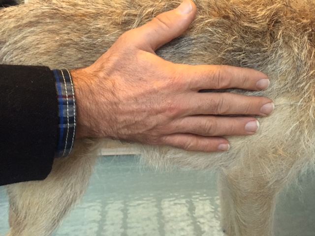 Now run your hand down the back. The back should have a cross-section that is round, with good muscle coverage and the tops of the spine only just detectable. This will get triangular and bumpy when your dog is too lean.
